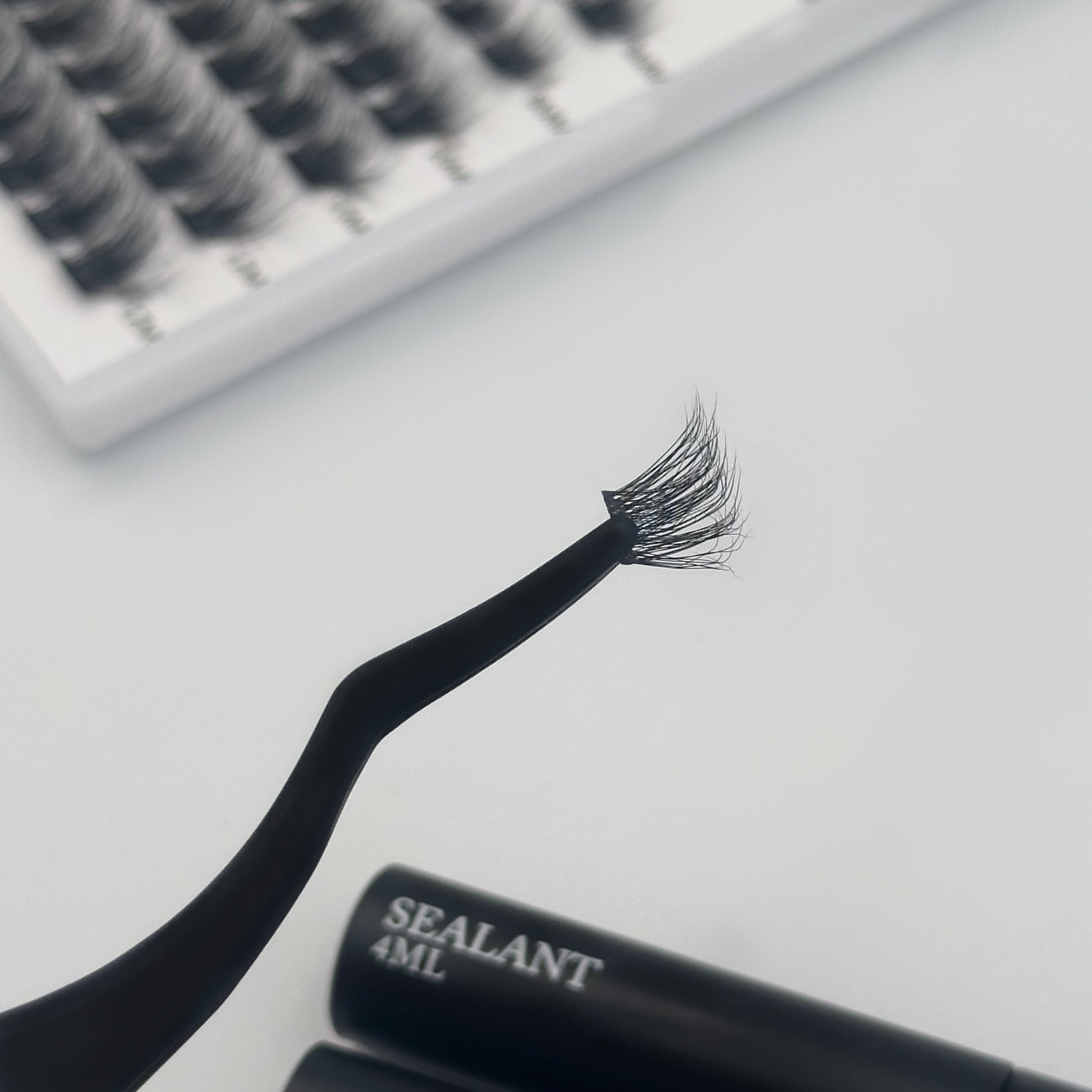 Black bond with an angled micro-wand to grip clusters to the lash line, plus a clear sealant with a brush-and-dab tip to lock your lash map in place.