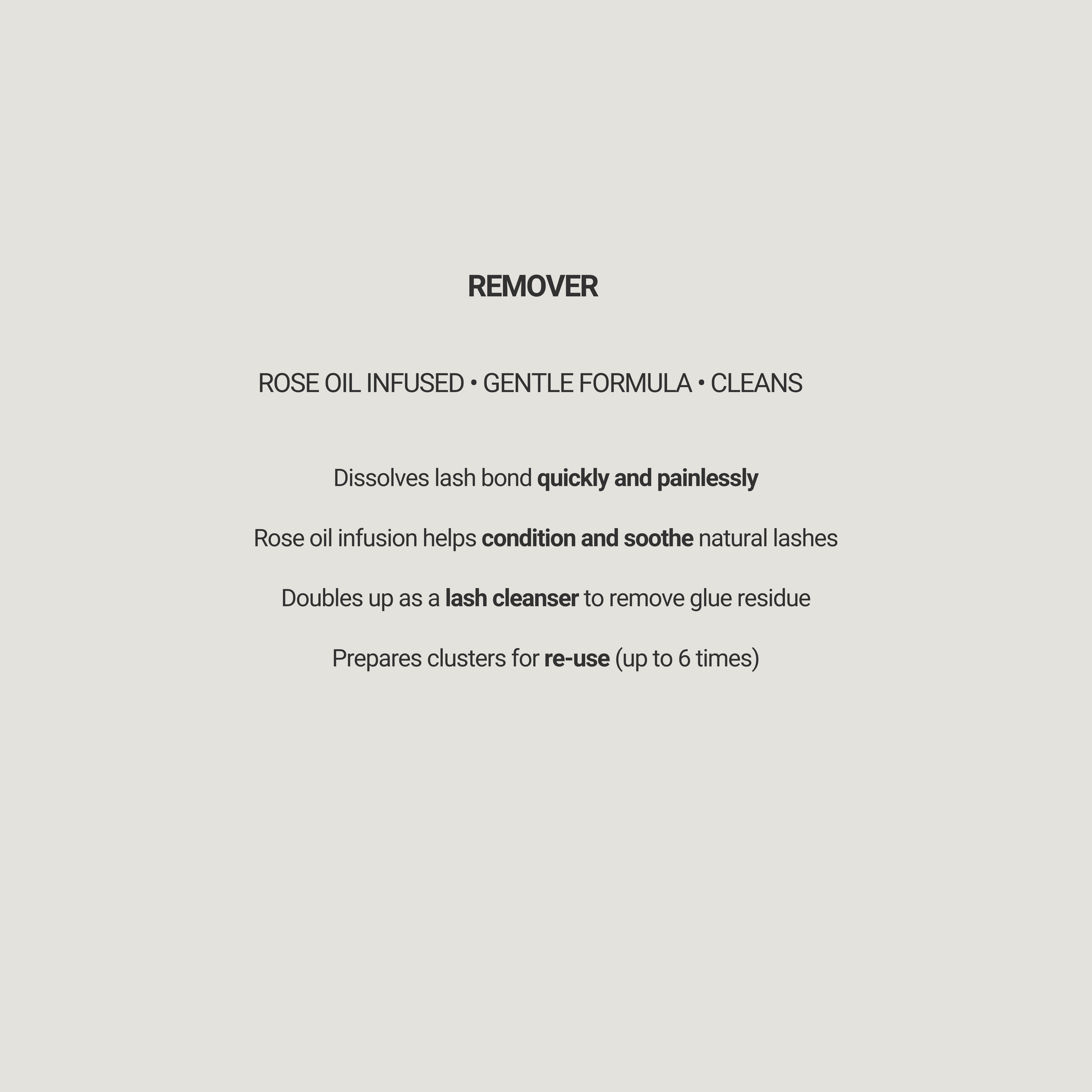 Gentle, rose oil–infused lash remover that melts away bond without tugging. Protects your natural lashes and keeps clusters reusable.